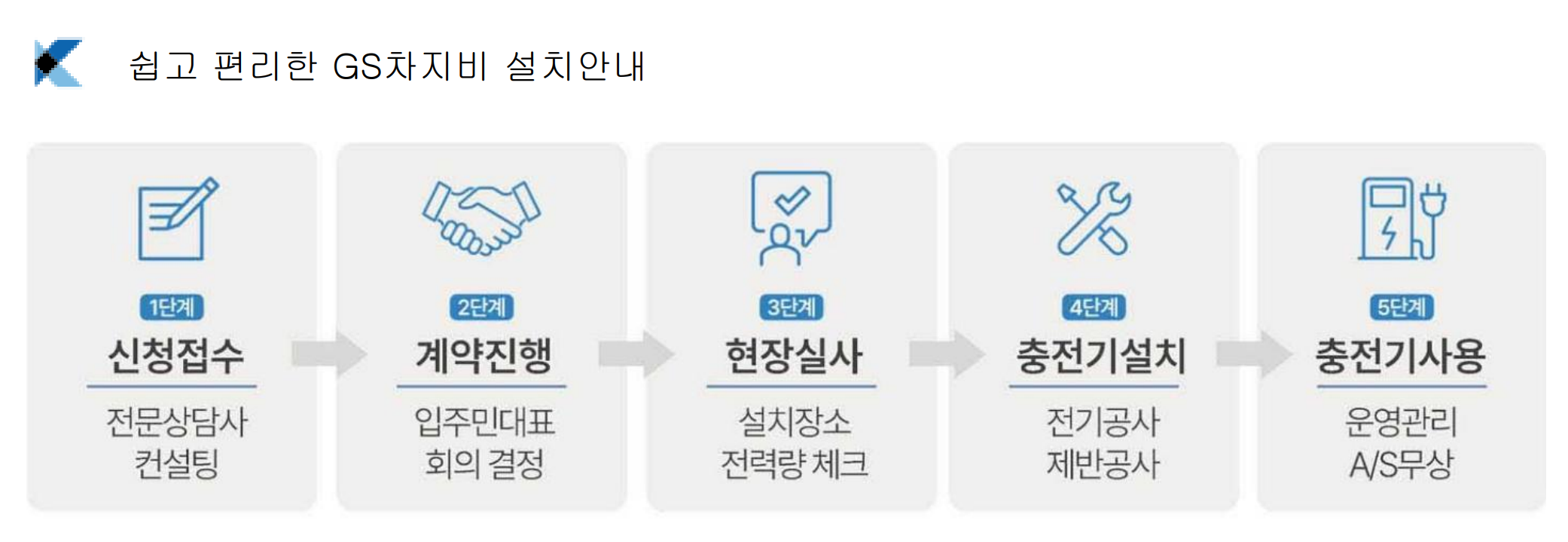 “전기차충전기, 설치하면 끝이 아니라 시작이라고 합니다 “ 운영계약은 최소 5~10년까지 장기적으로 안정적인 자본력과 기 술력을 갖춘 기업과 맺어야 하며, 전국 43,278 여기의 충전기 설치하였으며, 안정적인 운영경험과 노하우를 가지고 국내전기차 충전기 사업자중 업계 1위를 달리고 있는 GS차지비 라고 합니다. 기존의 GS와 차지비라는 업체가 합병되어서 새로운 회사가 되었습니다.