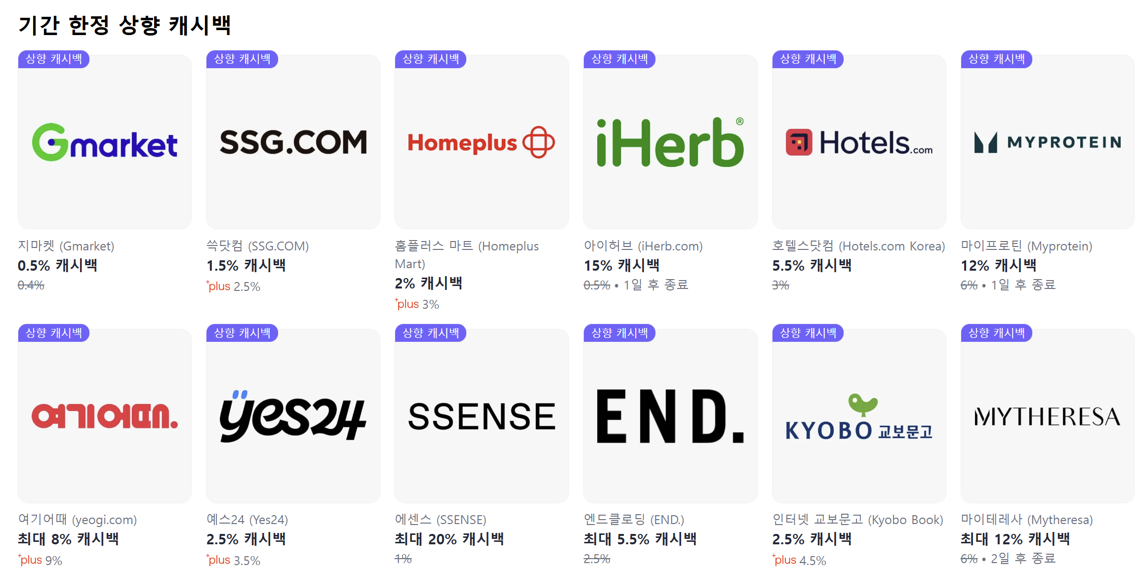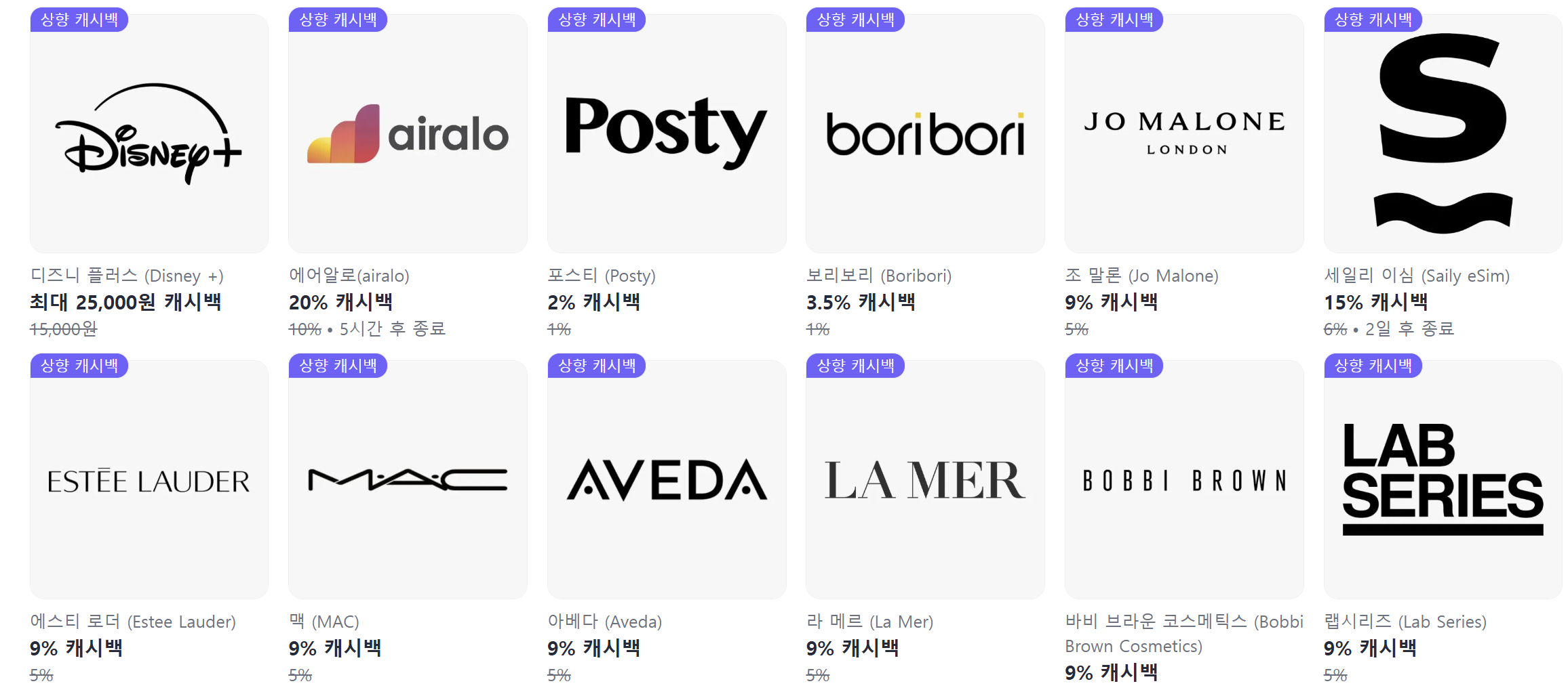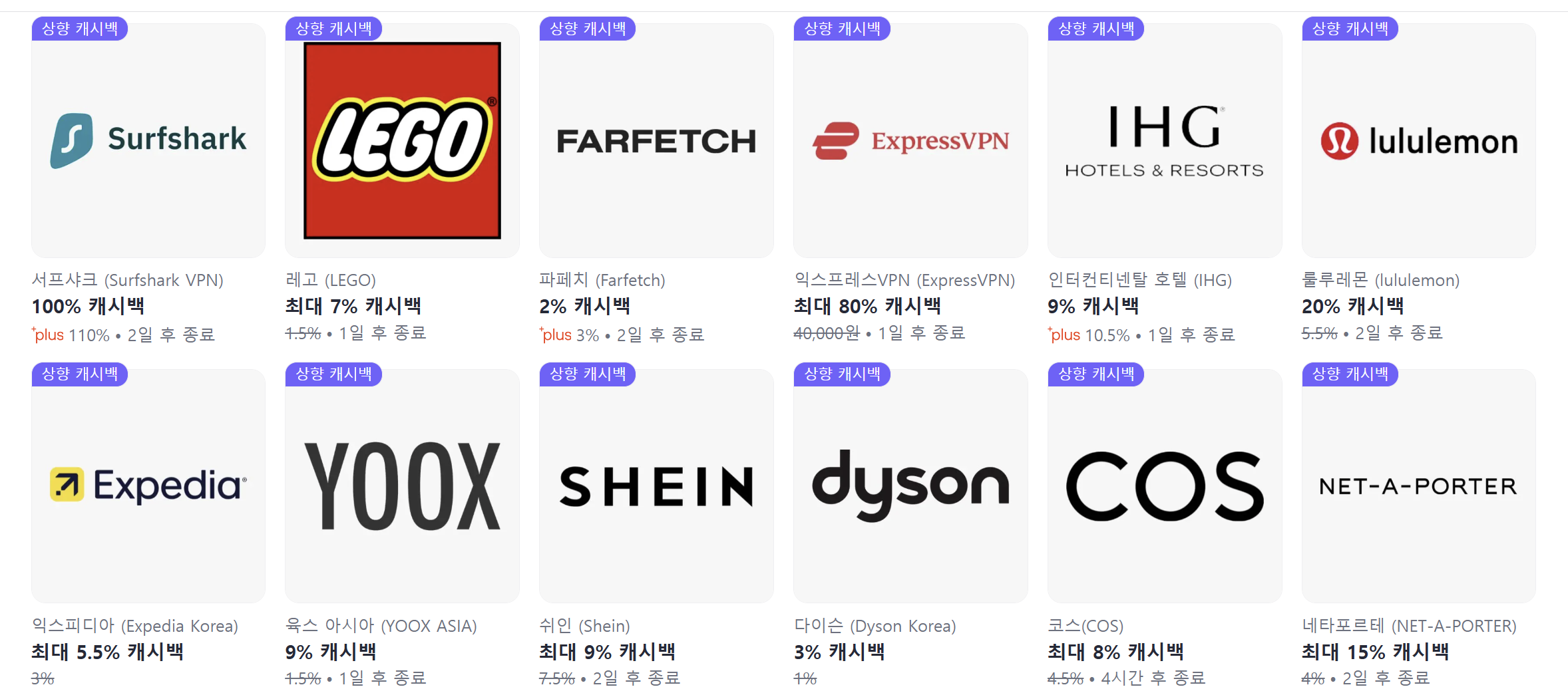 지마켓, 쓱닷컴, 홈플러스, 아이허브, 호텔스닷컴, 마이프로틴, 여기어때, 예스24, 교보문고, 마이테레사 엔드클로딩, 에센스, 서프샤크 100%(이건 내가 EXPRESS VPN 결재하고 다음날 80% - 100%로 상향되었다..ㅜㅜ) , 레고, 인터컨티넨탈호텔, 룰루레몬 20%(요즘 많이 보이는 여성분들 선호브랜드), 익스피디아, 윳스아시아, 쉬인, 다이슨, 코스, 네타포르테, 디즈니플러스, 에어알로(전세계 USIM구매사이트), 포스티, 보리보리, 조말론9%(면세점에서 사는 것보다 이득), 세일리이심, 에스티로더, 맥, 아베다, 라메르, 바비브라운, 랩시리즈, 타오바오, 알리익스프레스, 다양한 전세계 브랜드들이 다 모인것 같다.