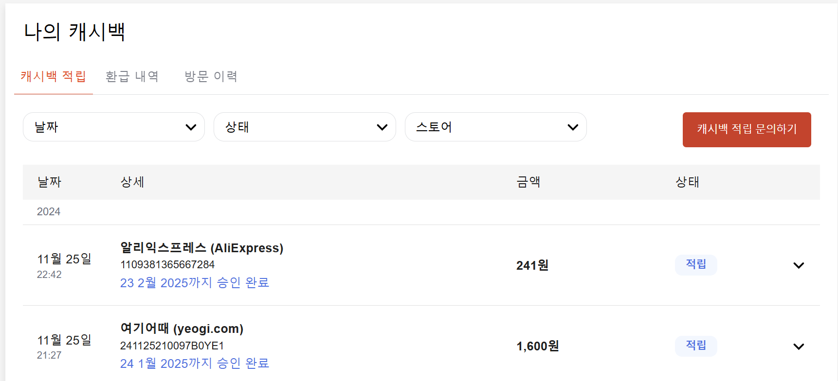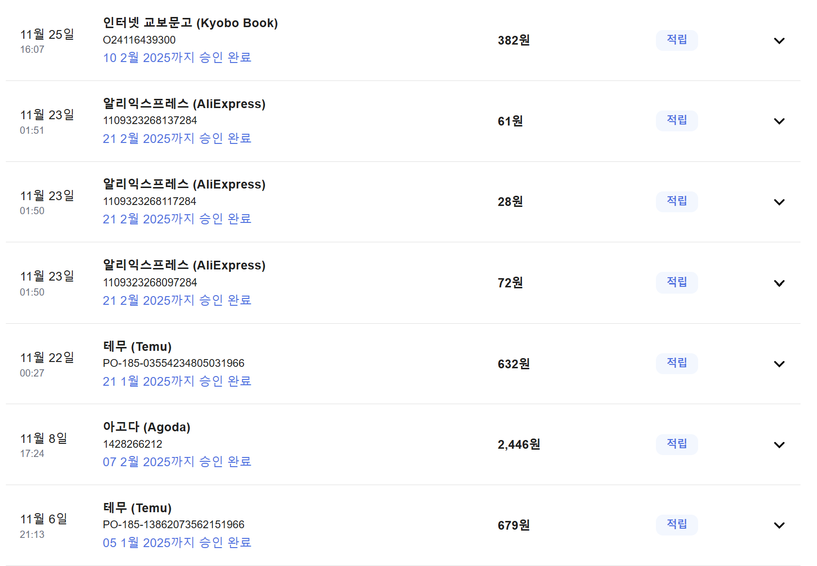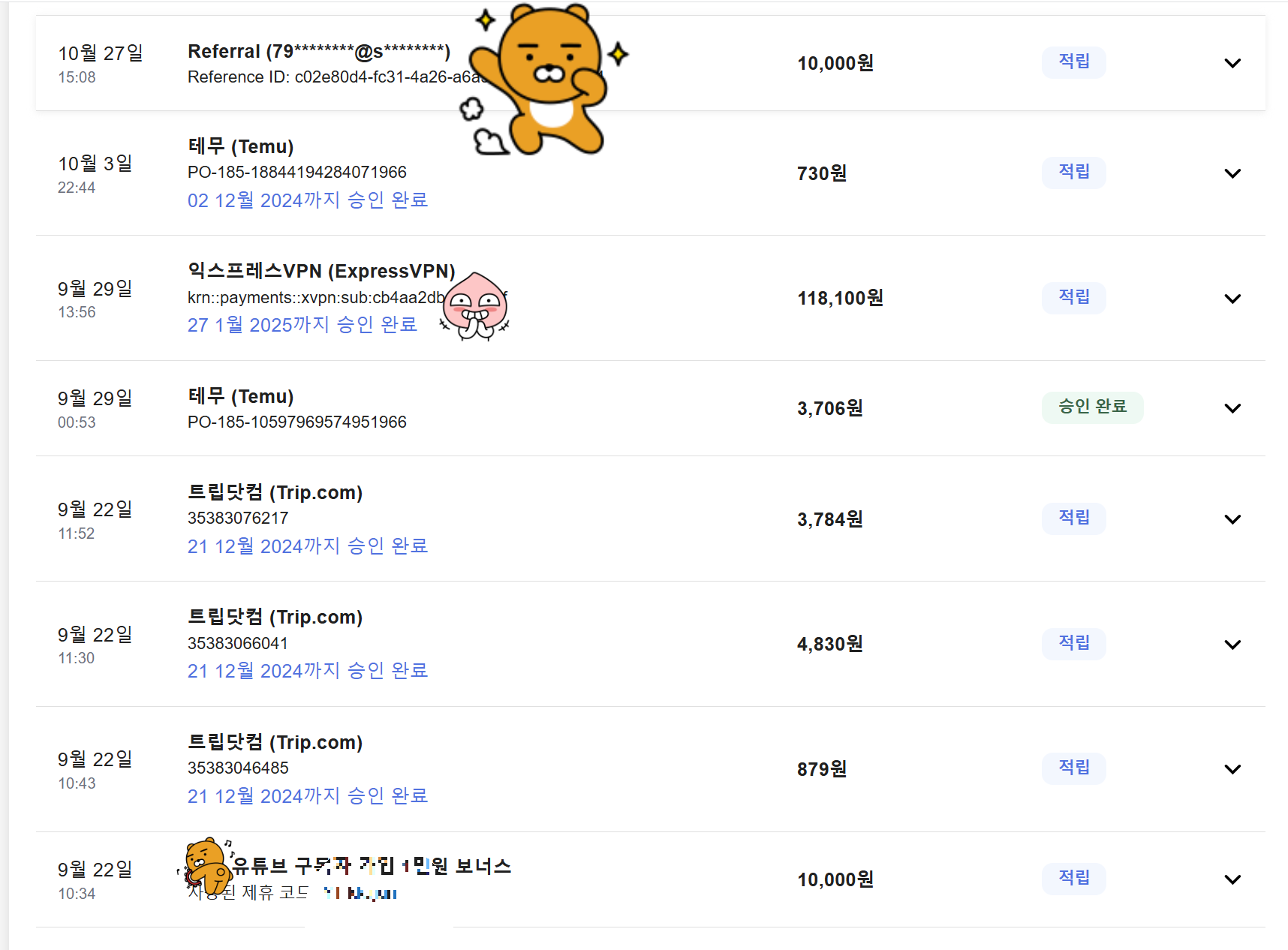24년 9월에 처음 가입하고 지금까지 알리익스프레스, 테무, 여기어때, 교보문고, 아고다, 익스프레스VPN(강추! 때론 100% 캐쉬백도 한다!), 트립닷컴, 친구추천까지 이용하고 현재 158,581원(2024년 12월 1일 기준)이 적립되어 있다. 차례로 환급받을 예정이다.